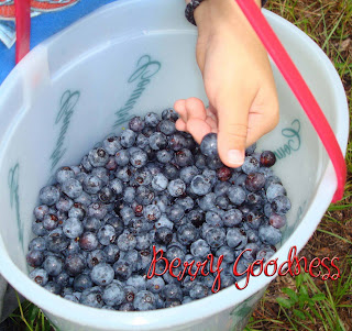 We had a berry yummy adventure yesterday at a local Blueberry field. After a nice Father's Day lunch, we went with a group of friends from church to a little blueberry field and brought home lots of delicious blueberries (in our pails and our bellies!). Ace had a blast running around and discovering the bushes with "a TON of berries" and even Lucky grabbed a few berries to add to the bunch.I love baking with blueberries, but at $4.99 a lb, cannot afford to do it often. Last year we got a bunch off our bushes, but they didn't do so well this year. We've wanted to go berry picking for awhile now so we decided no better time than the present! They were only $2.00 lb so we came home with 14 lbs of berried bliss!This morning we made blueberry pancakes and tomorrow morning we'll be savoring the delicious sweetness of Blueberry Cream Muffins.Here's the recipe:BLUEBERRY CREAM MUFFINSINGREDIENTS* 4 cups all-purpose flour* 1 cup sugar* 6 teaspoons baking powder* 1 teaspoon salt* 2 eggs* 2 cups milk* 1/2 cup butter or margarine, melted* 2 cups fresh blueberries or frozen blueberries** FILLING:* 1 (8 ounce) package cream cheese, softened* 1 egg* 1/3 cup sugar* Dash saltDIRECTIONS1. In a large bowl, combine the flour, sugar, baking powder and salt. In another bowl, beat the eggs, milk and butter; stir into dry ingredients just until moistened. Fold in the blueberries. Spoon about 2 round tablespoonfuls into greased muffin cups.2. In a small mixing bowl, beat cream cheese, egg, sugar and salt; place about 1 tablespoon in the center of each muffin cup (do not spread). Top with remaining batter. Bake at 375 degrees F for 18-20 minutes or until a toothpick inserted in muffin comes out clean. cool for 10 minutes before removing from pans to wire racks.*If using frozen blueberries, do not thaw before adding to batter.For anyone who likes to freeze berries, I've found that if I separate them (unwashed & dry) on cookie sheets and freeze them like that first, it's much easier to put them in bags and use as much as you need rather than having to defrost the whole bag.