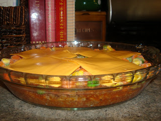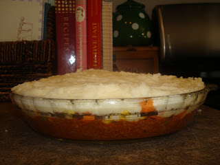 Today I made Lenten Shepherd's Pie for dinner. It is very easy and is great for non-oil days. Here's the recipe:Ingredients:1 bag soy ground meat (morningstar or boca crumblers)3/4 cup tomato sauce1/2 bag frozen veggies (I prefer carrots and peas for this)5 slices veggie cheddar cheese5-6 potatoessalt & pepper2 T. margarine1/2 cup soy milkDirections:Peel, chop and boil potatoes. Place soy meat and tomato sauce in skillet and heat thoroughly. Place meat at the bottom of a greased pie dish. Layer frozen veggies on top. Lay cheese slices on top of veggies. When potatoes are cooked, mash them together with the margarine, soy milk, salt and pepper. Bake @ 350 degrees for about 40 minutes. Enjoy with some fresh bread!Before potatoes are on top:Right before it went in the oven: