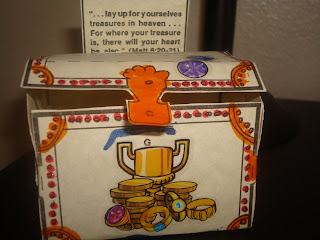 This is a card stock treasure chest that we got from the website of Phyllis Onest, director of Education for the Greek Archdiocese Pittsburgh Metropolis. We printed it out and then took it to Staples to have it printed onto card stock. We cut it out, colored and decorated it. It has over 40 "gold" coins with different "good deeds" printed on them. For example, read bible, help a neighbor, attend a church service, etc. Ace LOVES it! Every morning he picks his coin and then he does his good deed. It's really nice. :)When we finished it we read the correlating scripture verses and I explained to him that our good deeds are never overlooked or forgotten by God, they store up in Heaven forever. Ace also went to confession for the first time a few months ago so I thought it would be good to include that in our discussion. I reminded him how lucky we are for the sacrament of confession and said that when we sin it's like throwing rocks in our treasure chest. He wasn't happy with that and said "I don't want rocks in my treasure chest, I want treasures!" I then explained to him that the only way to get the rocks out was through the sacrament of confession. If we continue to confess our sins we will keep removing the rocks; and if we continue to do good deeds with a loving heart we will continue to fill our treasure chest in Heaven. Then he said with wide eyes "Boy, I wish I could see my treasure chest and play with it. I guess I'll have to wait until I go to Heaven." Then my tears came. What higher hope does a mother have than for her children to enter the Kingdom of Heaven? I pray that God keeps the zeal for His Kingdom in my children's hearts forever...