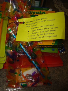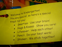 I am happy to report that Ace's 1st Day of Kindergarten went very well. I absolutely adore his teacher, she is the sweetest thing. At Meet-the-Teacher Day she had these adorable little treat bags on each student's desk along with a packet of information for the parents including their class schedules, etc.