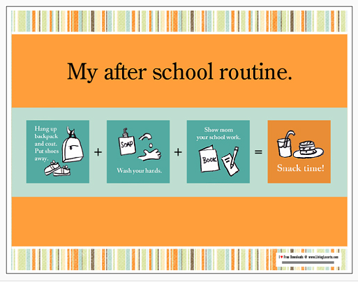 Wow! It's been a busy month!We had an awesome Night Before 1st grade party for Ace. We made our school bus cake again (this time instead of buying pound cake, I baked one using better ingredients in 2 loaf pans) and read lots of fun back-to-school books like The Night Before First Grade, If You Take a Mouse to School, First Grade Here I Come! and a few more favorites. We went over basic rules and safety precautions, practiced the pledge of allegiance, student pledge and made sure he had his student I.D. number memorized.He's had a great couple of weeks so far!Lucky and I have been busy at home playing G.I. Joe's and working on his shapes and recognizing letters of the alphabet. We've been using a lot of these free printables from First School.He's gotten back into his routine with no problem though. He'll still try to pull a quick one on me when it comes to doing his homework as soon as he gets home but I don't budge. :)Last year we printed this after school routine poster out from Living Locurto. We laminated it tacked it to the wall to remind Ace of what the first things he needs to do when he gets home. (We added "change school clothes" and "show Mom schoolwork" is now "Do Homework")