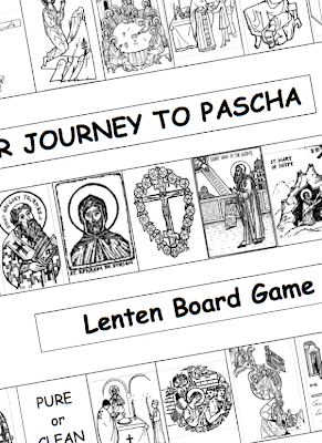 Last year, I printed out the story explaining why we dye our Pascha eggs red. I added it to the back of our binder along with the coloring sheets for holy week. It is available here from Orthodox Christian Education. The coloring sheets can be found here (sorry for the scribbles) :).The most recent thing I printed out is the Lenten Board Game from Phyllis Onest, director of education for the Pittsburgh metropolis (GOA). It has over eighty questions and answers and the board is composed of various icons from holy week, etc. The questions are a little advanced for Lucky, and some even for Ace, but I just paraphrase those ones into something slightly different to help them understand or make up my own questions on the really tough ones.