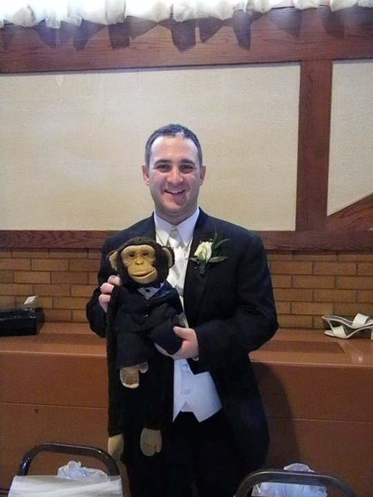 It was such a great day. The reception was a total blast. It had been a long time since I was there for a function that included the w h o l e family. It was awesome.I even bought a tux for my brother's childhood friend Henry the monkey. I kept teasing him before the wedding, telling him that someone he used to be very close with was coming to surprise him. He kept trying to ask questions like where is he from and where does he live now? I told him he was from Ohio originally but he hasn't been seen much lately and he's just sort of hanging around. I know, I have a strange sense of humor, I get in from my father. But we amuse each other so it works out just fine.Here they are after their reunion: